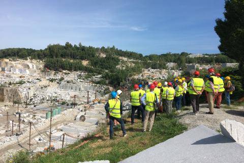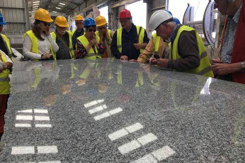 - Ensuite, les commissaires ont pu visiter l’atelier de transformation du granit brut extrait et admirer le savoir-faire et la finition après polissage de blocs de toute épaisseur ; Seuls de minuscules petits « crapauds » sont parfois perceptibles sur les faces finies. Quelques blocs de marbre issus de la carrière PLO dans les Pyrénées, à Sarancolin, ont laissé les visiteurs admiratifs, tant ce marbre poli est magnifique, il était connu de Louis XIV qui en avait fait poser à Versailles.